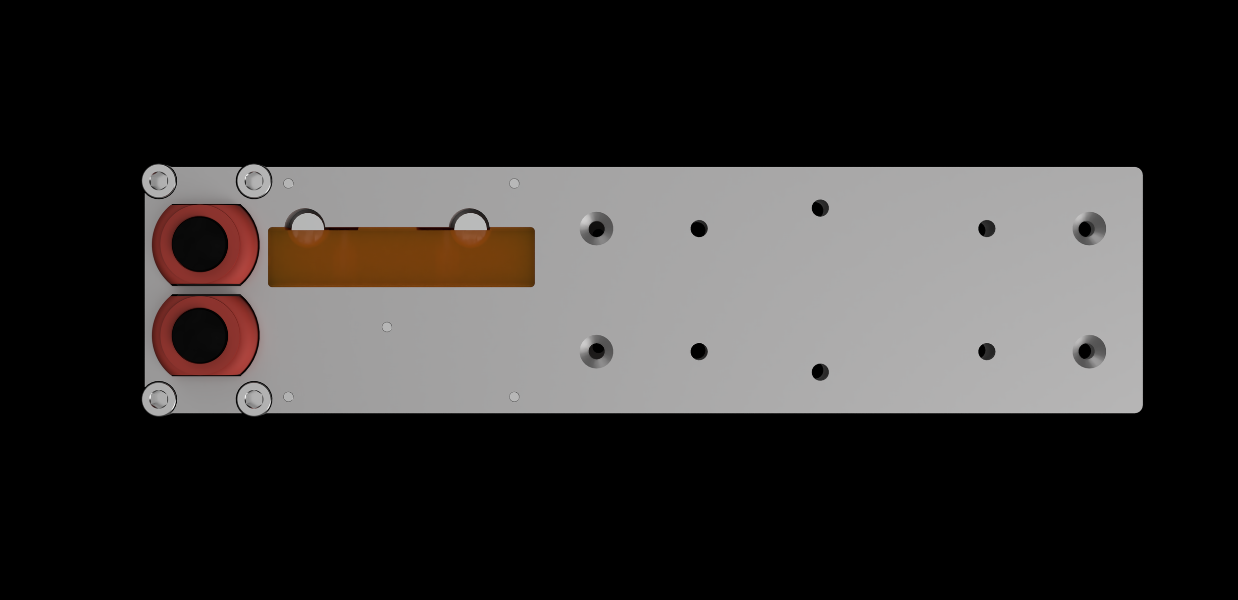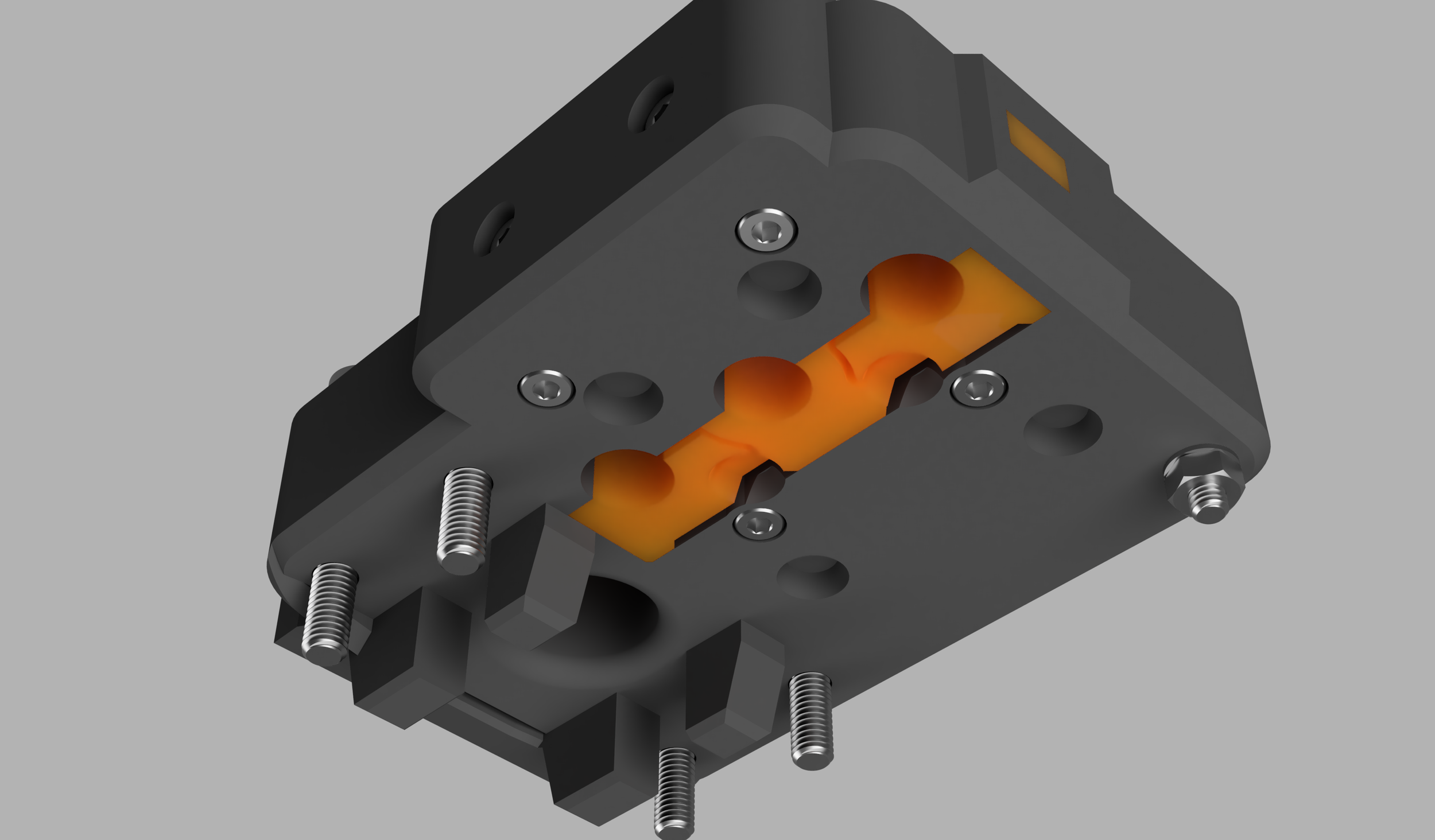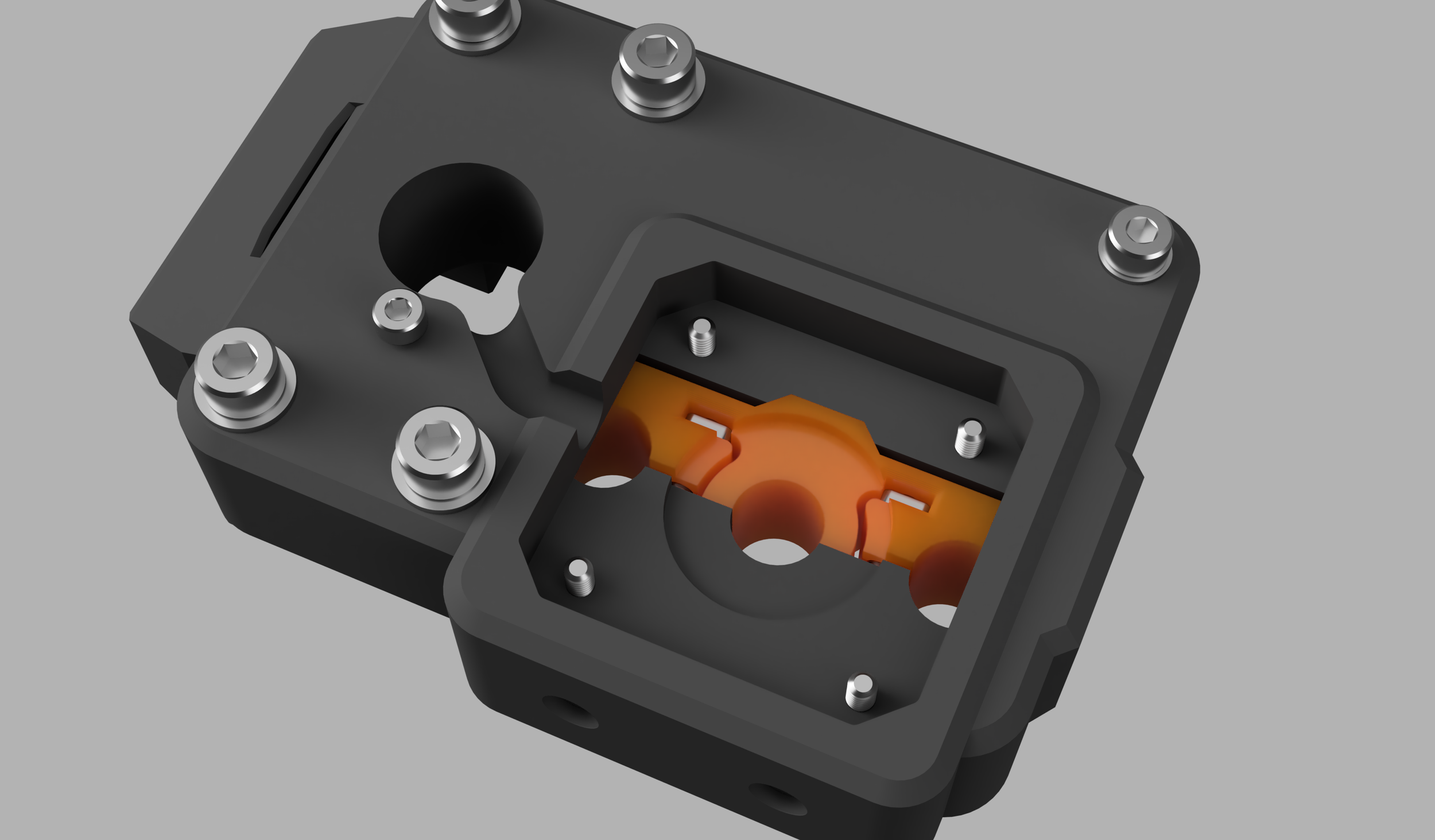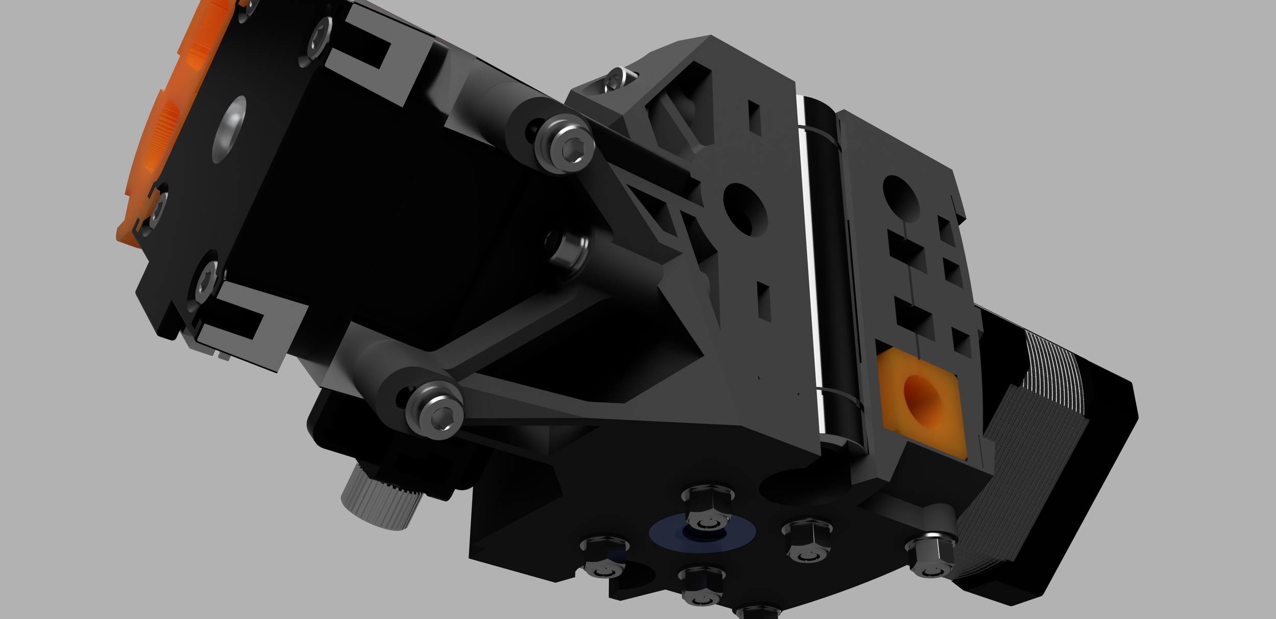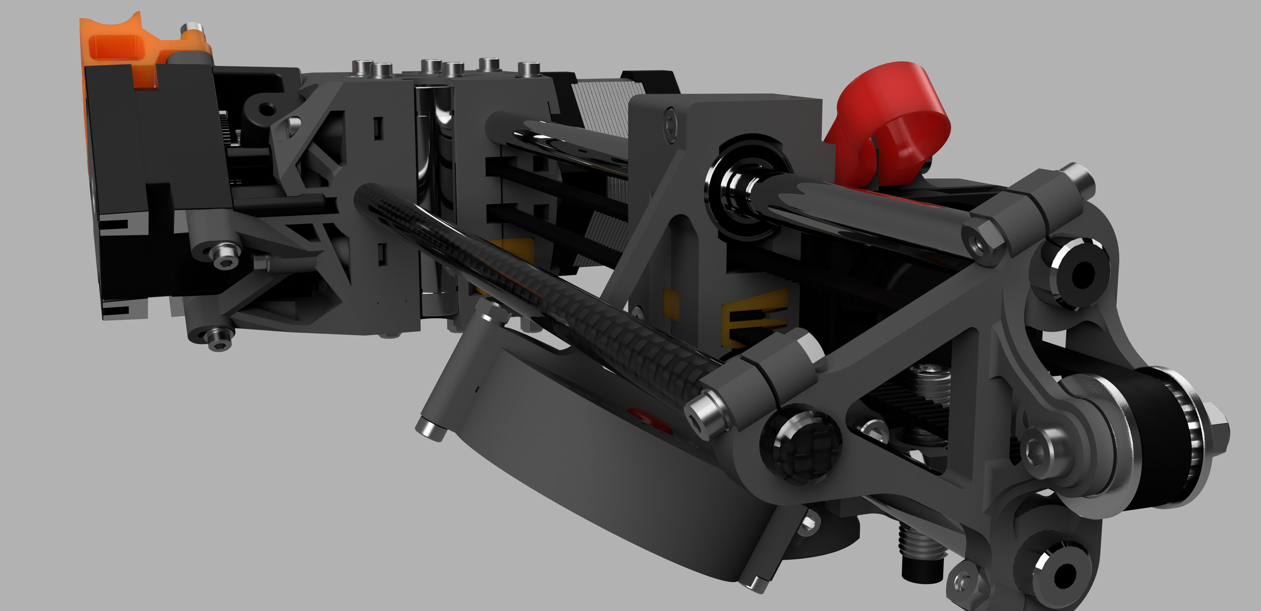 The build makes extensive use of carbon-fiber infused Polycarbonate (the dark gray material) along with the Prusa-standard PETG (orange). Using PC/CF for the print head and the far end of the x-axis gantry further reduces the weight of the x-axis to ensure fast retractions even with the three-rod gantry.