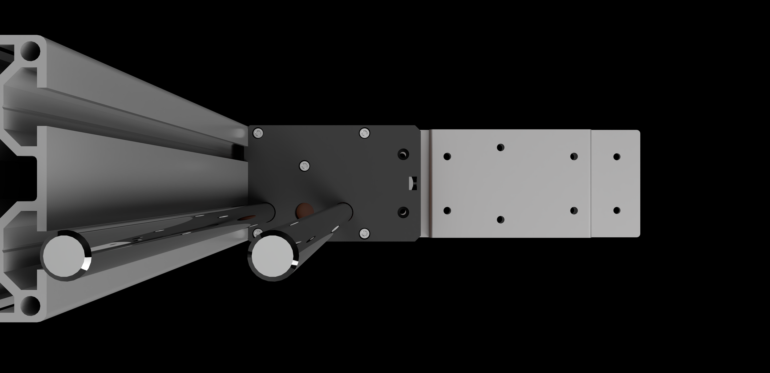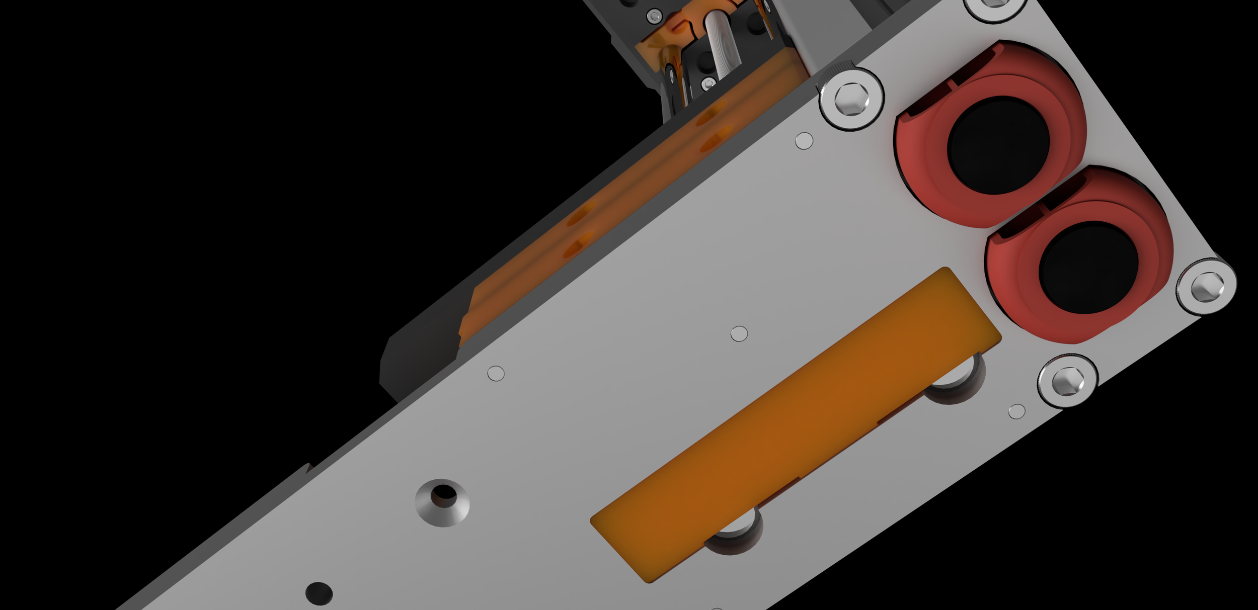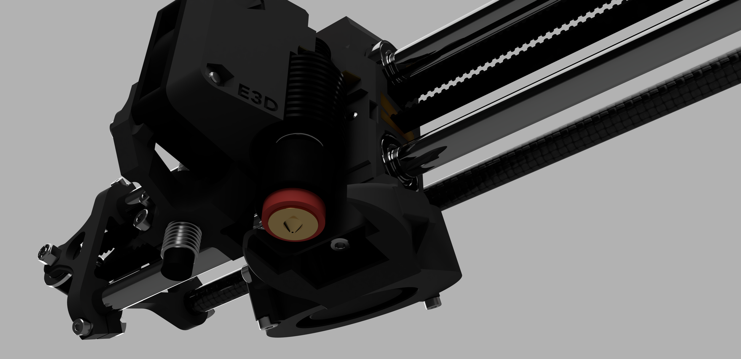 The print head borrows some elements from the Prusa MK3 head and the E3D Revo Hot End adapter for the Mini+ but rotates the Mini's cooling fan to allow for the third rod of the Super Mini's x-axis gantry. The additional weight of adding the third, carbon-fiber rod is made up by using hollow core rods for the first two.